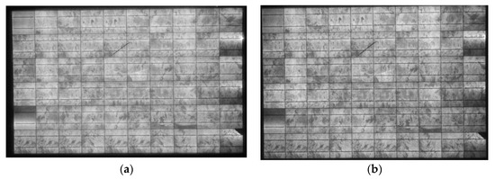 - The EL intensity was spatially more uniform in no3 compared to no1 and no2 at bias V > Voc in Figure 12c,f,g. In that V range, the Rs governed current I through the cells. Specifically, I vs. V was higher in no3 than no1 and no2, which implies that Rs was lower in no3 and higher in no2, which is in agreement to Table 2. The reverse is also true. In high-bias V the effectiveness in defect identification became poorer because the EL luminosity contrast reduced in almost all cells (Figure 12c,f,i).