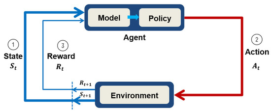 RL can be considered a Markov decision process. The agent selects an action according to its policy by observing the environmental state and then obtains a reward. Presumably, discovering the best move for the next action should provide the greatest reward. As shown in Figure 1, the agent performs an action A_t at a certain time t, and the state in the environment changes from St to S(t+1).