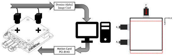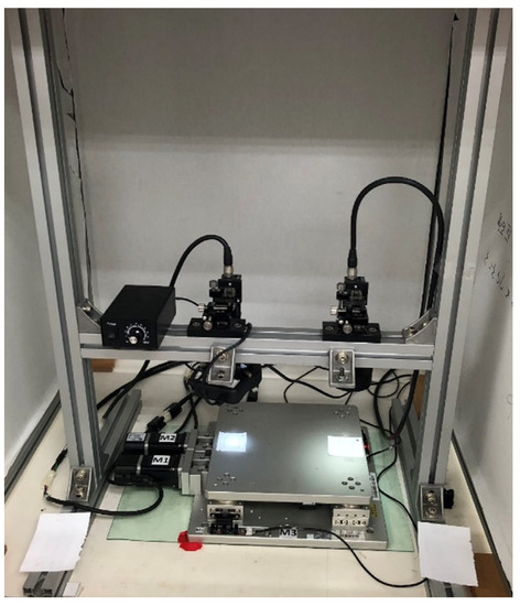 As shown in Figure 2, the coplanar XXY stage with two degrees of freedom (XXY-25-7, CHIUAN YAN Ltd., Changhua, Taiwan) [13] contains an image servo controller and two CCD cameras, which are mounted on the top of the system, as is the servo positioning sensor. A motion card (PCI-8143, ADLINK Technology Inc., Taoyuan City, Taiwan) controls the XXY stage [14], and ADLINK’s Domino Alpha2 image card is used for XXY stage image position feedback. A photograph of the XXY experimental stage is shown in Figure 3.