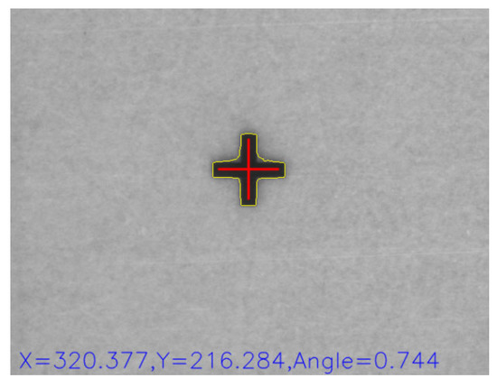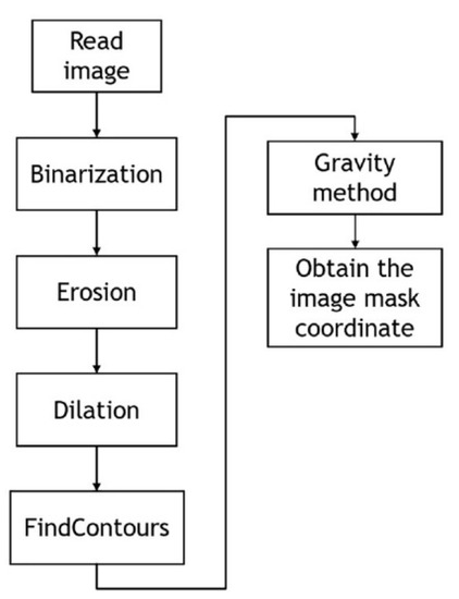 For the center-of-gravity method, grayscale images are acquired from multiple CCD cameras, and the image noise is removed using a filter. The binary threshold of the grayscale histograms is used to separate the two targets of the cross mark and the background. Expansion and subtraction are applied to remove the remaining noise, thereby enabling the optimal image to be produced through a morphological process. Subsequently, feature targets are identified using the findContours function of OpenCV (4.5.1). The center-of-gravity method can thus obtain the coordinates of the image center for the positioning mark. Figure 5 displays a flowchart of the image identification procedure, and Figure 6 displays the cross-mask position obtained by the center-of-gravity method.