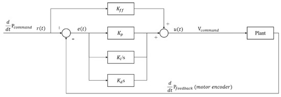 where r(t), e(t), u(t), Kp, Ki, Kd, and Kff represent the input command, system error, control variable, proportional gain, integral gain, derivative gain, and velocity feedforward gain, respectively. Figure 7 presents the architecture of the PCI-8143 motion card controller.