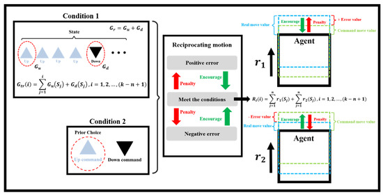 When the ball-screw drive system was frequently moved back and forth, heat was produced and wear occurred, which resulted in ball-screw elongation, reduced stiffness, and increased positioning error. Moreover, positioning error would have accumulated because of backlash if numerous error alternating compensation commands were requested. Therefore, a reward was given if the first command was Up (top left of Figure 8), that is, the follow-up motions were in the direction of the platform motion. This rule reduced the frequency of the feed-drive motor reversing its direction. Heuristically, this phenomenon causes reductions in temperature increases and frictional wear. The first Down command (top left of Figure 8) was also rewarded. Therefore, the transform reward function of Gtr for condition 1 is defined as in Equation (11).
