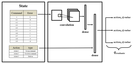 The DQN architecture used in the research is shown in Figure 9. The input of the network is the error data set of the XXY platform and the action space data set. The XXY platform error data set was passed through a convolutional neural network layer and combined with the action space data set. The layer denoted as “dense” in Figure 9 is the final fully connected layer, which outputs a set of Q values.