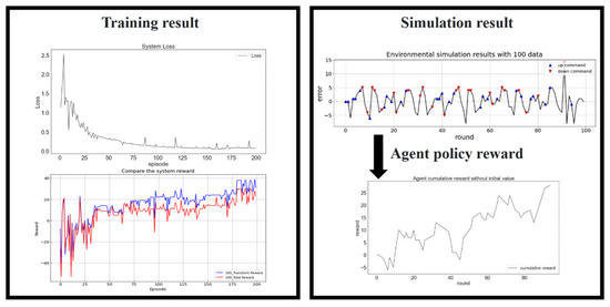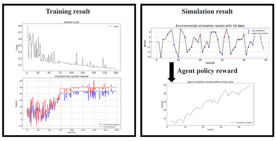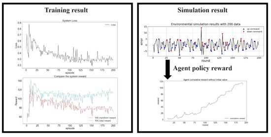 Figure 13 reveals that the loss function still converged after 200 episodes for 100 training data. A comparison of the top left and bottom left of Figure 13 revealed that the agent performed exploration to identify a better reward policy until episode 35. The policy was then continually modified in each iteration. Although some spikes appeared in the loss function during RL, the bottom left of Figure 13 reveals that these spikes corresponded to reductions in the reward.