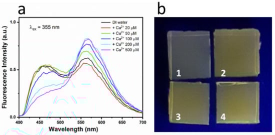 - Yu, S.; Li, W.; Fujii, Y.; Omura, T.; Minami, H. Fluorescent Spherical Sponge Cellulose Sensors for Highly Selective and Semiquantitative Visual Analysis: Detection of Hg2+ and Cu2+ ions. ACS Sustain. Chem. Eng. 2019, 7, 19157–19166. [Google Scholar] [CrossRef]