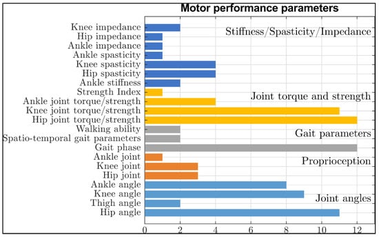 The eligibility criteria for this systematic review were defined using the PICO framework [] as follows. (1) Participants: We did not apply any exclusion criteria with regard to study population. Since exoskeletons are primarily used in therapy settings, we opted to not make any restrictions regarding diseases or physical limitations. Likewise, we did not make any restrictions regarding age of study participants. (2) Intervention: We only included studies that used lower-limb exoskeletons or wearable robotic devices for assessing motor performance. We considered all devices, regardless of whether they support only one joint (e.g., ankle, knee, hip) or multiple joints. Fixed-frame exoskeletons were also considered. Studies that examined exoskeletons for other body parts such as back, arms, or hands were not considered for this review. Similarly, rigid robots that do not have an exoskeletal structure were excluded from this review. In terms of motor performance, a wide range of parameters was considered. We were mainly interested in balance (i.e., the ability of keeping the body in a stable position thereby avoiding falls), joint angles (i.e., the angle between two body segments connected by a joint), muscle strength (i.e., the ability to generate force), proprioception (i.e., the awareness of the position and/or movement of body parts), muscle stiffness (i.e., the resistance of muscle to length change, mainly static), muscle impedance (relation between force and length of a muscle relying on a combination of stiffness, damping and mass), and various gait parameters such as phase, speed, or step length. Studies in which cognitive parameters were measured were excluded. Studies that merely simulated an exoskeleton were also excluded. (3) Comparison and outcome: No inclusion or exclusion criteria were defined regarding comparison and outcome parameters. Studies comparing data collected through an exoskeleton with a (clinical) gold standard/laboratory instrument were desired. Furthermore, we only considered studies published in English or German.