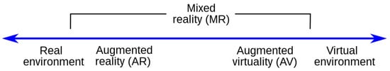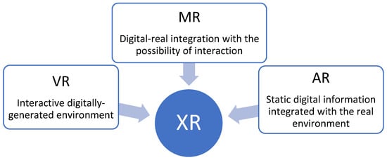 Currently, the broader term XR (extended reality) refers to any immersive experiences that incorporates varying degrees of digital and real information. In particular, the meaning of VR remains the same, while AR is used for static digital information integrated with the real environment and, in the case of a digital–real integration with the possibility of an interaction, the proper term becomes MR (Figure 2) [].