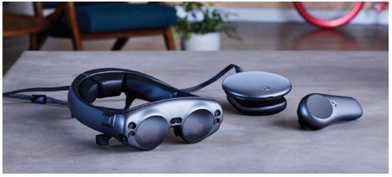 Another hardware difference between the two HMDs is associated with the position of the processing unit: the unit is integrated into HoloLens 2 (Figure 4), whereas in Magic Leap 1, all of the hardware is positioned in a separate case) to attach on the belt or to wear with a crossbody) connected to the glasses via cable (Figure 5).