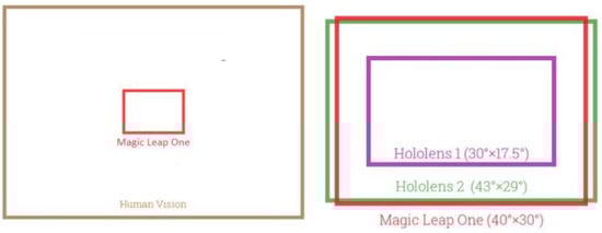 As shown in Table 1, the field of view (FOV) of the two devices is similar; the FOV of HoloLens 2 is larger than that of its predecessor, but still far from covering the entire human field of vision (Figure 6).