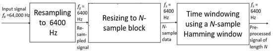 Firstly, we reduced the sampling rate of the data segments from 64,000 Hz to 6400 Hz. Secondly, we resized the resampled data segments into data blocks with lengths of N samples, which is set here as N = 64,000 (10 s). To reduce the end effect, each resized block was time-windowed using a N-sample Hamming window [14]. It should be noted that computational complexity can be reduced through resampling due to the processing of data at a lower sampling rate. On the other hand, resizing leads to saved memory by compressing the signal along time without modifying its spectral content [15]. Figure 1 shows a flow diagram of the signal processing steps employed in the preprocessing stage. Here, the resampling was performed using a polyphase anti-aliasing filter, whereas the resizing was performed by a “nearest-neighborhood” interpolation.