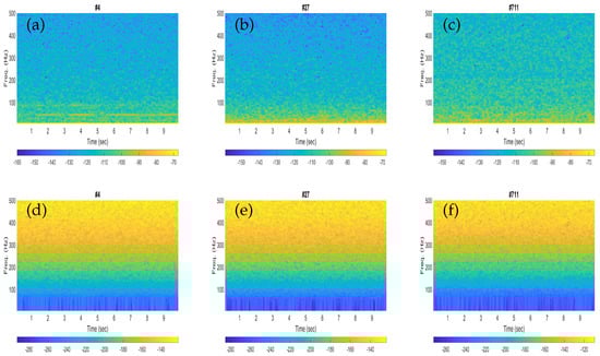 Similarly, the spectrograms of the three noisy recordings containing fin whale calls are depicted in Figure 3a–c, whereas the corresponding noise-only signals are shown in Figure 3d–f. Each spectrogram was plotted for an input signal of 10 s by using a Hann window of length 1600 samples (250 ms) with 75% overlap, whereas the sampling frequency of the signal was downsampled to 6400 Hz, the same as in Figure 2.