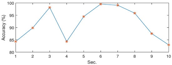 For a given dataset , where n refers to the dimensionality of the input data and m is the total number of samples, consider how the expression of a hyperplane is , where w is the trainable weight vector of the SVM classifier, x is the feature vector, is the kernel function, and b is a bias. Thus, if the point is on the hyperplane, ; if the point is not on the hyperplane, the value of could be either >0 (positive) or <0 (negative) (considering two classes for binary classification problem optimization). The two SVM parameters, that is, the regularization parameter and the kernel’s scale parameter are set to 10 and 0.05, respectively, where the radial basis function (RBF) is used for the kernel function. The SVM used in our simulations was the least-square SVM (LS-SVM). Additionally, the feature vectors were normalized to zero-mean and unit variance before being fed into the SVM classifier. In Table 5, the average accuracies (%) from 100 trails are presented for the three datasets.
