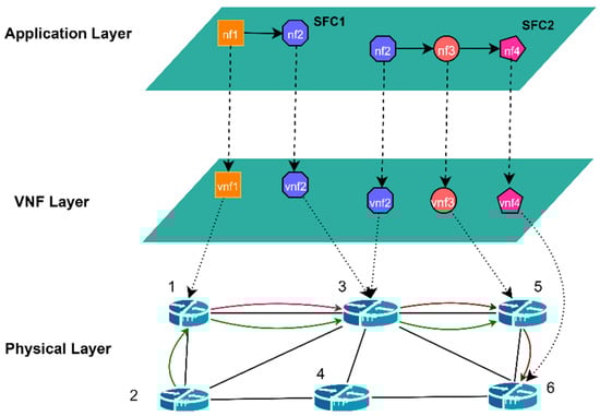The network architecture considered in this study is a three-layer NFV architecture [,], as depicted in Figure 1 (the Notations used in the model are shown in Table 1). The physical layer consists of physical nodes (servers) connected by physical links in the underlying network. In the VNF layer, VNFs are instantiated on physical nodes that provide the required resources. In the application layer, different NFs are deployed on the corresponding type of VNFs to form SFCs.