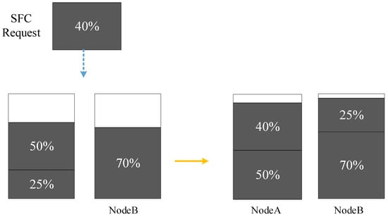 Most existing studies on the dynamic SFC deployment problem neglect the readjustment of the deployed SFCs, which can be beneficial in some cases. Figure 3 shows an example of such a case, where NodeA and NodeB have equal CPU resources, and the grey squares represent the CPU resources occupied by the VNFs. Suppose NodeA’s CPU resources are 75% occupied and NodeB’s CPU resources are 70% occupied. A new SFC request that requires 40% of the CPU resources cannot be deployed successfully. However, if we move a VNF that occupies 25% of CPU resources from NodeA to NodeB, we can deploy the new SFC request after the readjustment []. Moreover, the readjustment enables us to deploy the new SFC on a path with lower latency to meet the requested latency requirements.
