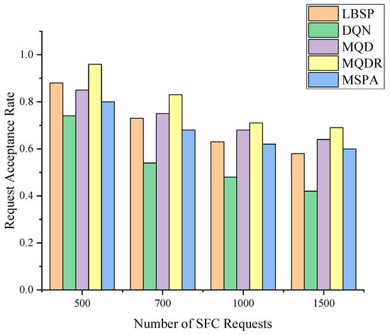 Figure 6 compares the request acceptance rates of the five different methods at different request quantities. We conducted 20 experiments for each request quantity and generated different sets of SFC requests according to the same parameters every time. We then obtained the average result. The five methods were as follows: (1) LBSP, a load-balanced shortest path algorithm [], which deployed SFCs with fewer resources and used the shortest path delay route for stable performance; (2) MSPA, a method that selected the set of m nearest well-resourced nodes to the previous VNF, denoted as , and then randomly chose a node from to deploy the next NF; (3) DQN, an online SFC deployment method based on deep Q networks []; (4) MQD combined DQN with MSPA, where the agent selected one node from at each step; and (5) MQDR, which extended MQD by dynamically readjusting already deployed SFCs, as described in Section 4.