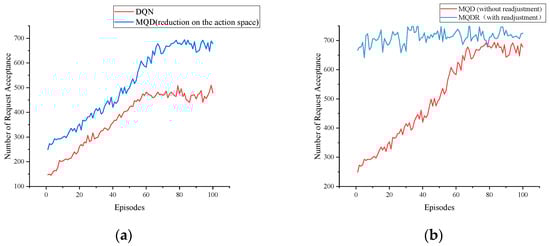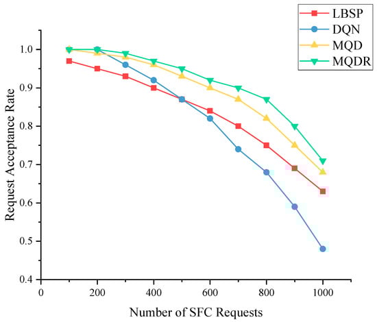 Figure 7a,b show the training process of DQN, MQD and MQDR 3–5 when the SFC request quantity is 1000, and Figure 8 depicts the request acceptance rate of each algorithm as the requests arrive.