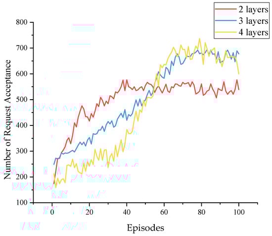 Figure 9 shows the Q-network’s different training processes with different hidden layers. Table 3 presents their performance in the test environment. The figure indicates that the three-layer and four-layer networks achieved similar results in training, while the three-layer network performed better in the test. Too many layers may cause overfitting and gradient instability during training. The two-layer networks performed the worst, as they were not deep enough to perceive all the intrinsic features.
