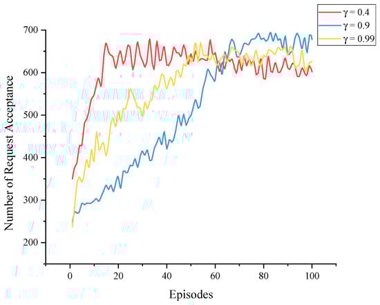Figure 10 shows the effect of different discount factors on the training of the agents. The discount factor is used to calculate the target value during training and to regulate the immediate and long-term effects in reinforcement learning, i.e., how far ahead the agent considers when making decisions, in the range (0,1]. The larger the is, the more steps the agent considers going forward, but the more difficult it is to train; the smaller the is, the more the agent focuses on immediate benefits and the easier it is to train. Although we want the agent to think in the long term, excessively high discount factors may impede algorithm convergence. As observed in Figure 10, training proceeded swiftly when , and the best result was achieved when . On the other hand, the algorithm trained most slowly when , implying that, while unfinished services can influence dynamic deployment, it is not necessary to consider overly long-term impacts in a limited training cycle.