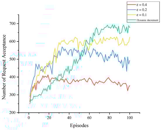 The training used the approach to enhance the agent’s exploration ability. represents the probability that the agent will randomly choose an action. The best states are often explored only with a good enough Q-network. If is too large, excessive exploration in the later stages of training may affect the utilization of acquired knowledge and hinder further performance improvement. If is too small, on the other hand, it may lack sufficient exploration in the early stages. Instead of setting to a fixed value, the dynamic decrement strategy started with , the strongest exploration, and gradually reduced it in a linear fashion until it reached 0.05, and then it remained constant. This approach provided adequate exploration in the initial stages and maximized the use of acquired knowledge in the later stages. The simulation results depicted in Figure 11 demonstrate that the dynamic decrement strategy prolonged effective learning time and ultimately yielded better training outcomes.