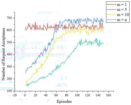 The impact of varying m on agent training is shown in Figure 12. The MDQR algorithm requires an appropriate value of m to balance between exploration and exploitation. When m is too small, it approaches the LBSP algorithm (m = 1), which limits the selection space and may miss better actions. When m is too large, it approaches the original DQN algorithm (m = n), which increases the selection space and may cause training difficulty. Therefore, choosing a suitable value of m is crucial for the performance of the MDQN algorithm. In our simulation experiments, we achieved the best results when m was 5.