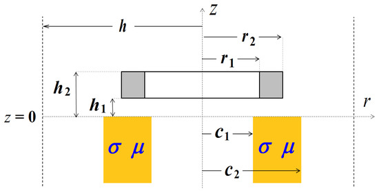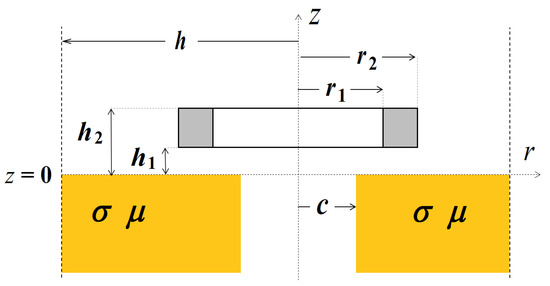 The proposed method can be used for any number of sub-regions. In the case of the conductive ring (Figure 4), the solution domain contains three sub-regions: air (0 ≤ r ≤ c1), conductive material (c1 ≤ r ≤ c2), and air (c2 ≤ r ≤ h). This geometry may describe, for example, the eddy current nondestructive inspection of a tube. The solution can be written as: