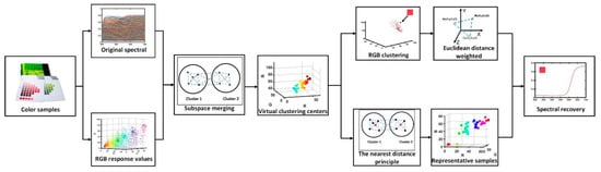 As can be seen in Figure 1, firstly, the response values and spectral reflectance information of the color samples are obtained. Secondly, after obtaining the corresponding response value information, subspace merging is carried out according to the distance. Finally, after the merging points are obtained, we can divide it into two categories. The first type is directly partitioned for spectral recovery, and the second type is used in the latest training sample data to replace virtual points in order to directly obtain the restored spectral reflectance.