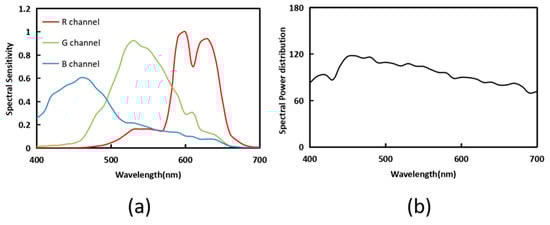The simulated environment is described in this section. The NokiaN900(Nokia Corporation, Espoo, Finland) is selected as the spectral sensitivity function, and the CIE D65 is selected as the light source environment in Figure 2.