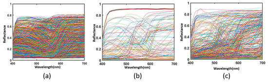 All the spectral reflectance data from in the experiment are presented in Figure 3. Figure 3 shows that our experiment involves three kinds of color chips. Figure 3a shows the Munsell Matt chips with 1269 color chips. Figure 3b shows the 140 ColorChecker SG. Figure 3c shows the 354 Vrhel spectral dataset. The spectral reflectance ranges from 400 to 700 at a 10 nm interval.