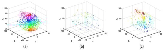 After analyzing the spectral information data, the response value information is also analyzed. The equipment that obtains the response values greatly depends on the real environment. The camera response value depends a lot on the equipment, which is not a uniform space. In order to facilitate better observation and description of the color, the CIE Lab space with good spatial uniformity is selected as the description background. The full name of Lab is CIELAB, sometimes written as CIE L *a*b*. It is a color pattern developed by the CIE (International Commission on Illumination). Therefore, in Figure 4a, it can be easily seen that the data are distributed uniformly in space, which describes the LAB information of Munsell Matt chips. From Figure 4b,c, it is also easy to see that since the color chips selected are ColorChecker SG and Vrhel spectral dataset, the number is obviously smaller. The LAB is calculated under CIE D65 illuminants.