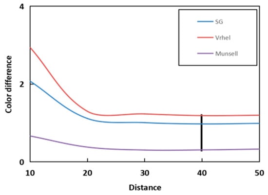 After the spectral information and response values of the experiment are introduced, the proposed method is tested in the following sections. Distance is used as a parameter in the experiment, and the number of merging iterations between subspaces becomes more and more with the increase in distance. The number of center points is also less and less with the increase in distance, but this does not mean that the center point can directly determine whether the recovery accuracy is good or bad, due to the complex relationship inside. Therefore, the relationship between parameters and accuracy is explored through experiments. In Figure 5, the Munsell Matt chips are used as the training samples. It can be easily seen that both the self-recovery and the recovery of the ColorChecker SG and Vrhel spectral datasets have the best results under the distance of 40. As can be seen from Figure 5, when the Munsell Matt chips are used to recover the other three kinds of data, the results all have the same trend of change. So, the distance is set to 40.