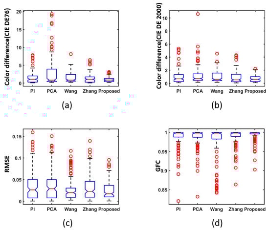Boxplots of simulated experiment results: (a) CIEDE 1976 color difference, (b) CIE DE2000 color difference, (c) RMSE and (d) GFC.