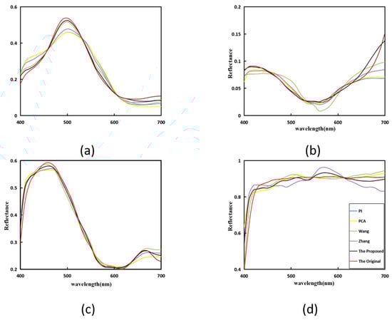 Spectral reflectance recovery results from our proposed and existing methods with four randomly selected samples (Wang [], Zhang []): (a) 18, (b) 22, (c) 92, and (d) 40.
