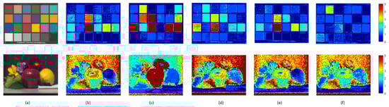 It can easily be seen in Figure 8 that the results comparison of the spectral images uses the different methods to recover spectral reflectance. Figure 8a represents the original RGB image. Figure 8b–f is called the error map, which calculates the color difference of the spectral reflectance recovered by different methods. More red means a larger color difference, and more blue means a lesser color difference. Therefore, the proposed method shows better performance.
