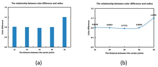 The relationship between mean color difference and distance (a) Columnar statistical chart and (b) Linear statistical graph.