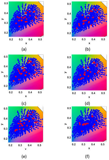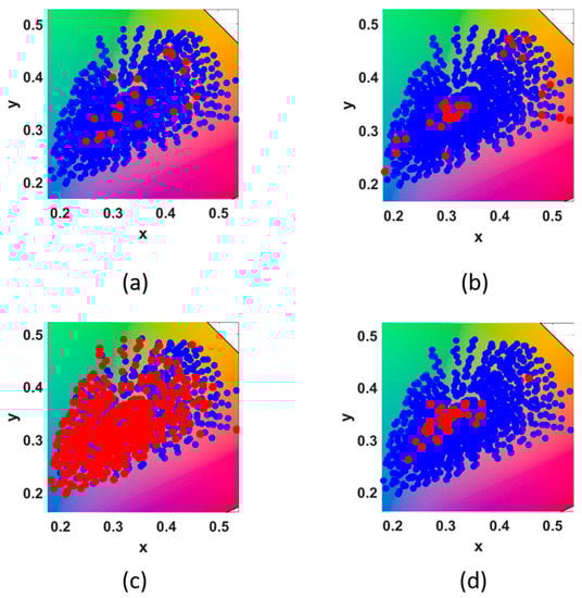After processing selected representative samples, Figure 10 shows the distribution of the training samples and the representative samples selected by several methods in the xyY space. Blue points represent training points and red points represent representative points. Timo Eckhard [] discussed the sample selection method proposed above, and we select his detection results as the selection samples. Liang’s [] selected sample used 60 in his article. Figure 10a represents the distribution of selected samples obtained by the proposed method. Figure 10b uses Cheung’s method to calculate the distribution of the selected samples in the training sample. Figure 10c represents Hardburg’s method to calculate the distribution of the selected samples in the training sample. Figure 10d uses Liang’s method to obtain the selected samples. The red dots represent the selected representative points, and the blue dots represent the overall data in Figure 10 and Figure 11.