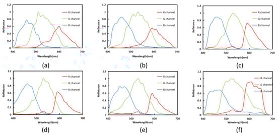 The distribution of spectral sensitivity functions of four selected digital cameras: (a) Canon5D Mark II, (b) Canon60D, (c) Nikon D3, (d) Nikon D50, (e) PentaK5 and (f) Sony Nex5N.