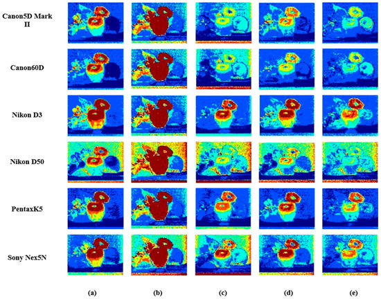 Results comparison of fruit spectral images in different methods using six spectral sensitivity functions as the spectral sensitivity: (a) PI, (b) PCA, (c) Wang [], (d) Zhang [] and (e) the proposed.