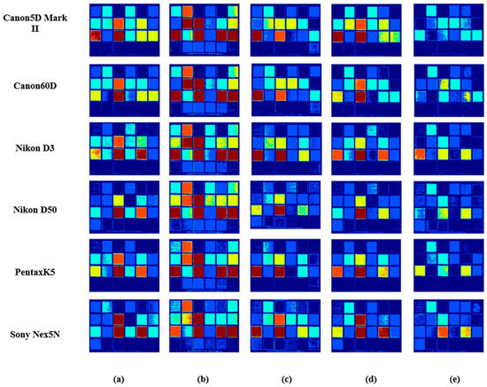 Results comparison of ColorChecker spectral images in different methods using six spectral sensitivity functions as the spectral sensitivity: (a) PI, (b) PCA, (c) Wang [], (d) Zhang [] and (e) the proposed.