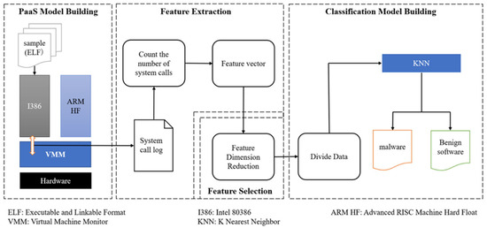 This section describes the developed cross-architectural dynamic analysis, entitled MDABP. Figure 1 reveals that MDABP analyzes the given dataset in four steps: PaaS model building, feature extraction, feature selection, and classification model building. In the PaaS model building step, we build two virtual machines in the host machine to ensure that the samples of the corresponding CPU architecture can be executed. In the feature extraction step, we input the samples sequentially into a virtual machine to execute and then record the log of system calls generated by the virtual machine in the host. Each log’s number of system calls is counted through a Python script and converted into a system call vector. In the feature selection step, the dimensionality of the system call vectors is reduced after we remove the system calls with a total number of zero, and the system call vectors of all samples are combined into two feature datasets. Finally, we input two feature datasets into the K Nearest Neighbor (KNN) model for training and classification. Next, we describe each step in detail.