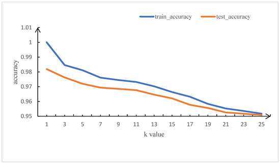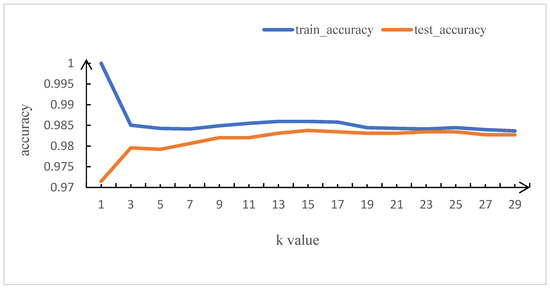 Next, we retested MDABP on the X86-32-based dataset, which contains 554 malicious samples and 219 benign samples. The corresponding average training and testing accuracy are presented in Figure 3. After trial and error, for k = 3, the KNN model achieves the highest average accuracy of 97.62% and the highest recall rate of 99.34%.