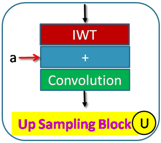 The up–sampling block provides IWT and convolution operations. Information from the skip path ‘a’ is also concatenated.