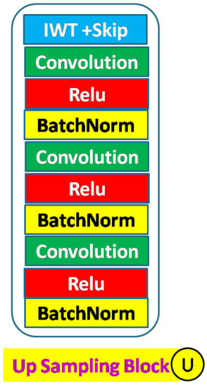 A decoder up–sampling block is shown in Figure 6 and consists of an IWT layer for up–sampling and a learnable convolution block. The convolution block is similar to the encoder and can be replaced with a residual block. Two inputs are received (a) from the preceding block and (b) from the skip function. The input from the skip layer is concatenated. The number of convolutions, batch normalization, and activation layers in the convolution block is variable. A typical full decoder block is shown in Figure 7. Each up–sampling block feeds the next block. There are five up–sampling blocks.