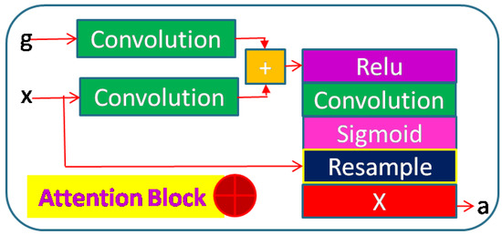 Typically, the skip layer feeds the encoder output to the decoder. The skip function improves the feature details while up–sampling in decoders. The skip paths go to every decoder horizontally (same scale). This provides nested dense skip functions totaling 10. We also add an attention gate inside the skip layer. This skip layer takes two inputs, one from the preceding encoder block (higher scale) and one from the horizontal encoder block (same scale), and provides input to the attention gate. A strided–convolution operation on the lower input lets us match the feature dimensions. Summing these two vectors results in higher aligned weights and small unaligned weights. The resultant vector is fed to a ReLU function followed by a convolution to reduce the feature dimensions to 1. This vector is finally scaled within [0, 1] using the Sigmoid activation function. This stage gives the attention coefficients. The attention coefficients are upsampled to the dimensions of the lower scale and multiplied with the lower scale input. This input is given to the decoder block. Figure 8 represents the attention block.