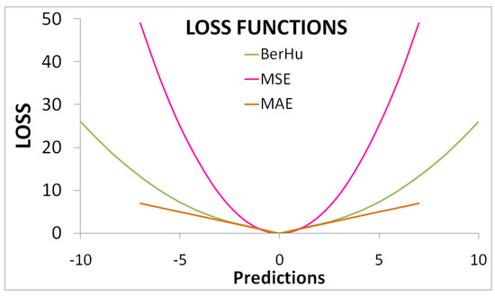 A loss function reduces the training loss and estimates depths comparable to the reference labeled data by converging the model, through gradient descent, during training. Hence, an optimum formulation is crucial for good performance and faster training. The convergence is helped by error functions such as the Mean Absolute Error (MAE) or the L1 loss function. This loss is robust to outliers as it has a large and constant gradient. The orange curve in Figure 10 shows the simulated loss. The pixel–wise error for MAE is given as:
