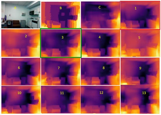 Depth map prediction after training, a visual comparison. A: Input image, B: Ground Truth, C: UNETP, 1: NDWT (3C, 3R, 3Bs) + Bs, 2: NADWT (3C, 3LR, 1Bs), 3: NADWT (3C, 3LR, 1Bs) + Bs, 4: NADWT (3C, 3Bs, 3R) + Bs, 5: NADWT (3C, 3R, 3Bs) + Bs, 6: NRDWT (3C, 3R, 3Bs) + Bs, 7: NRDWT (3C, 3Bs, 3R) + Bs, 8: NARDWT(3C, 3LR, 3Bs) + Bs, 9: NARDWT (3C, 3R, 3Bs) + Bs, 10: NARDWT (3C, 3Bs, 3LR) + Bs, 11: NARDWT (3C, 3Bs, 3LR), 12: NARDWT (3C, 3LR), 13: NARDWT (4C, 4Bs, 4LR) + 1Bs).