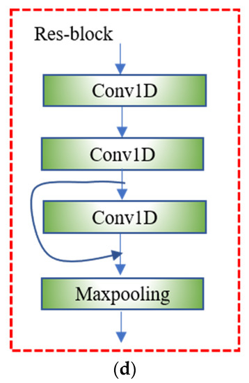 For the ResNet, residual blocks are significant characteristics and provide a multi-receptive field due to the skip-connection. Inspired by residual networks in computer vision, a simple ResNet is designed to diagnose bearings’ faults. The constructed structure of the model can be described as follows: {Input (4096,), convolution (1024, 4), residual block (512, 8), max-pooling (256, 8), residual block (256, 16), max-pooling (128, 16), residual block (128, 32), max-pooling (64, 32), flatten (2048,), dense (128,)}.
