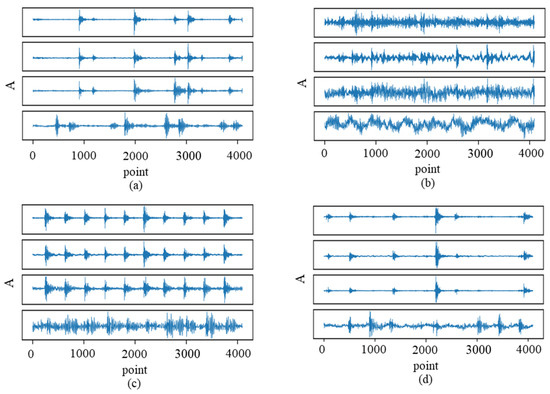 Waveform of vibration and acoustic signals. (a) inner race fault; (b) normal; (c) outer race fault; (d) roller fault.