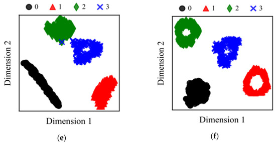 Feature representation of the methods in task A→B. (a) MLP; (b) BiLSTM; (c) CNN; (d) ResNet; (e) DA-CNN; (f) DA-ResNet.