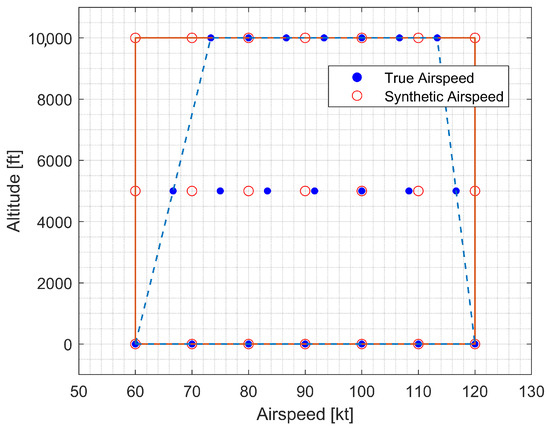 Note that a rectangular parameter grid is necessary for the LPV controller design. However, the trimmable region of the GTM appears triangular in the TAS versus altitude diagram. The service ceiling is approximately 30,000 feet, where the trimmable TAS converges to 100 knots. Therefore, a new speed-related parameter must be introduced so that the parameter domain becomes rectangular. In this study, the following synthetic airspeed was introduced [35]: