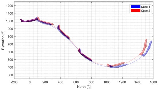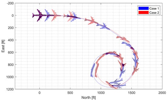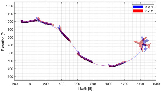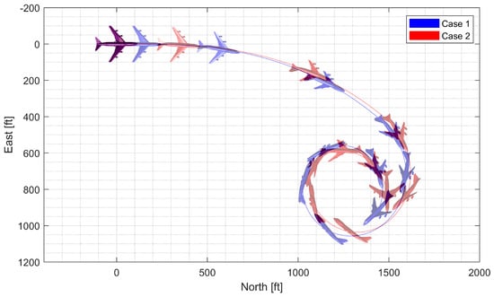 where is the geodetic latitude, is the longitude, h is the height above ground, is the Earth’s radius, , , and are the north, east, and down components of the velocity vector in the local geographic coordinate system, respectively, U, V, and W are the x-axis, y-axis, and z-axis components of the velocity vector in the body-fixed coordinate system, respectively, , , and are the Euler angles (roll, pitch, and yaw angles) of the vehicle body axes relative to the geographic system, respectively, and s and c stand for the sine and cosine, respectively. The forward-right-down system was utilized for the body-fixed coordinate system, whose origin is fixed at the vehicle’s CM.
